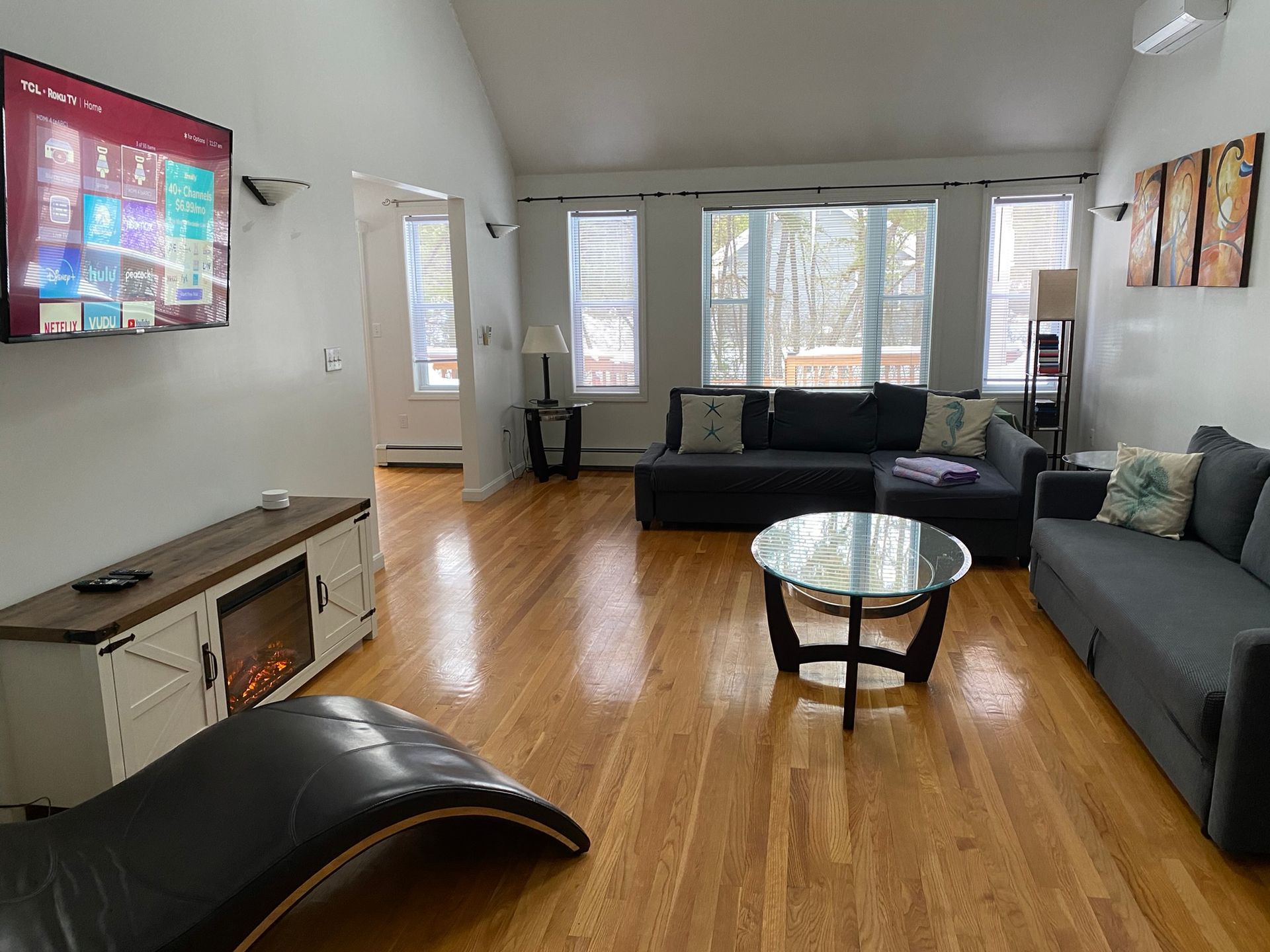 The house has 3 bedrooms, 1 King bedroom with full-size crib, 2 queen bedrooms and 2 queen sleeper sofas in the living room.